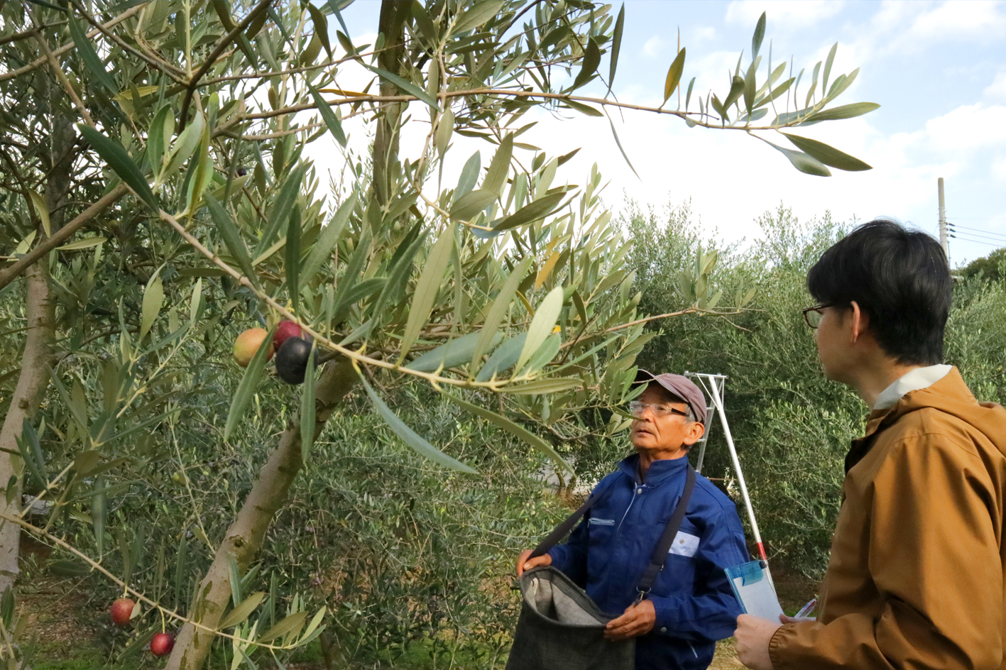 アグリオリーブさん(以下、アグ)「いえいえ。今年は新漬け用のオリーブの収穫が早くに終わり、次はオイル用の実が熟すのを待っている所です。なので、今は時間があるんですよ(笑)。例年なら、新漬け用の実を収穫していく内に、オイル用の実が熟すんですが、今年は台風の被害が無いおかげもあって、実が非常にキレイなので収穫がとってもスムーズでした。本来は、木から収穫する際に病気や傷で傷んでいるものを選別しながら収穫しているので非常に手間が掛かるんですが、今年の実は非常にキレイでほとんど手間なく収穫できたので、オイル用の実が熟すまで時間が掛からなかった。なので、今は少し時間があいているんですよ」