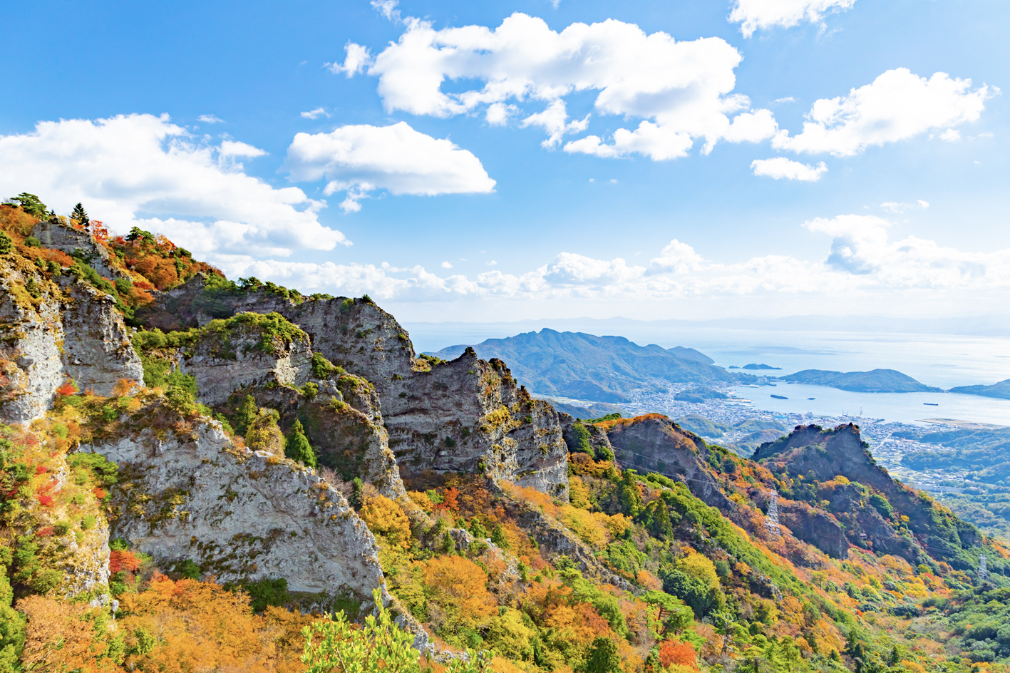 ロープウェイから美しい溪谷と瀬戸内海の素晴らしい景色を一望できるほか、片道約1時間の登山道も整備され、体力に合わせてハイキングも楽しめます。