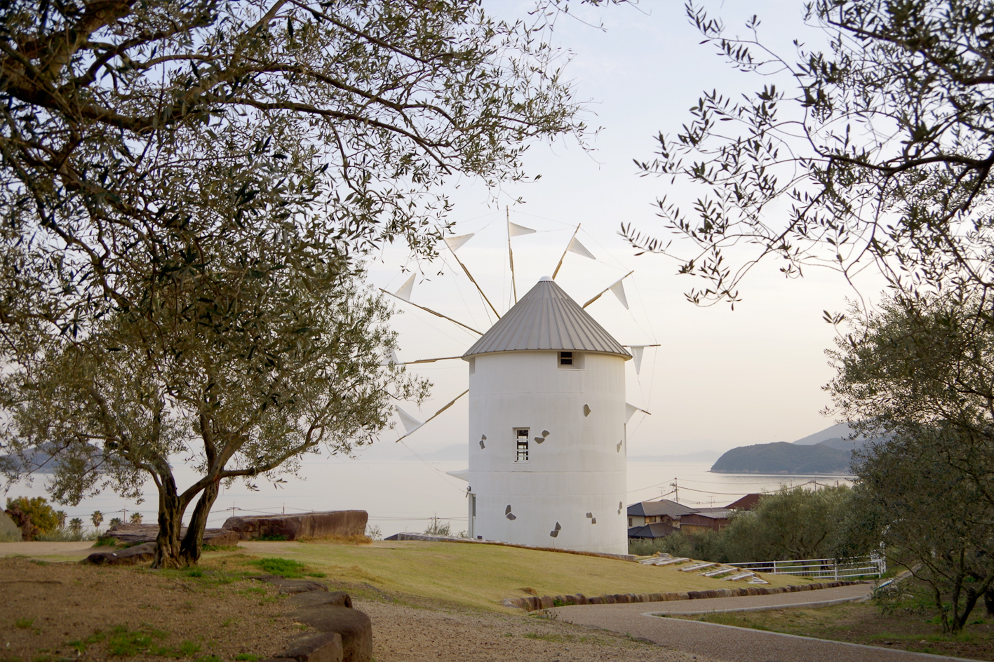 「道の駅 小豆島オリーブ公園」近くの丘の上に建つ風車小屋の前で、「主人公キキ」のようにほうきにまたがった姿を撮るフォトスポットとしても人気です。