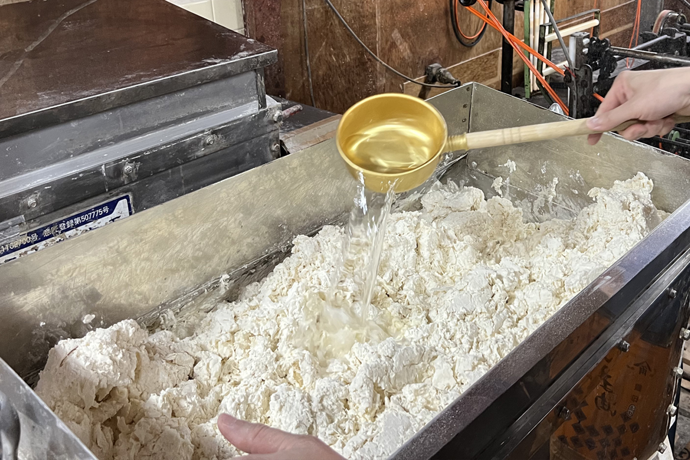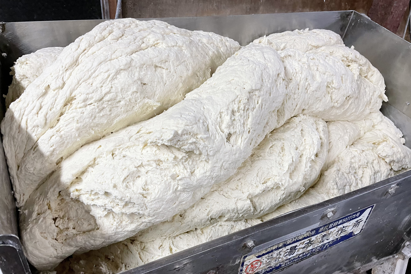 ネビツの中で熟成させた麺を、まず手で引っ張り、熟成具合(麺の硬さ、のび具合)を確認します。