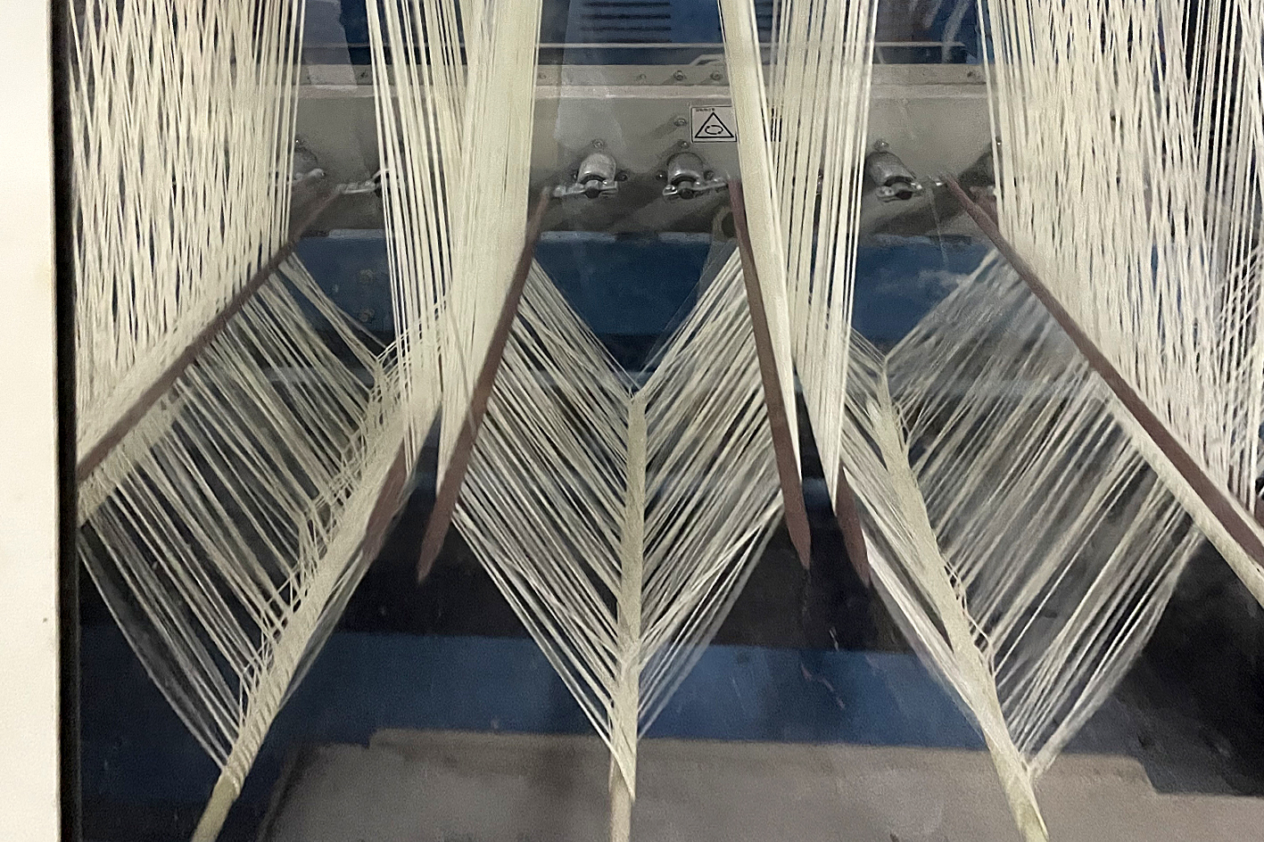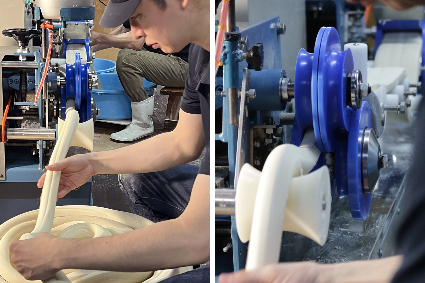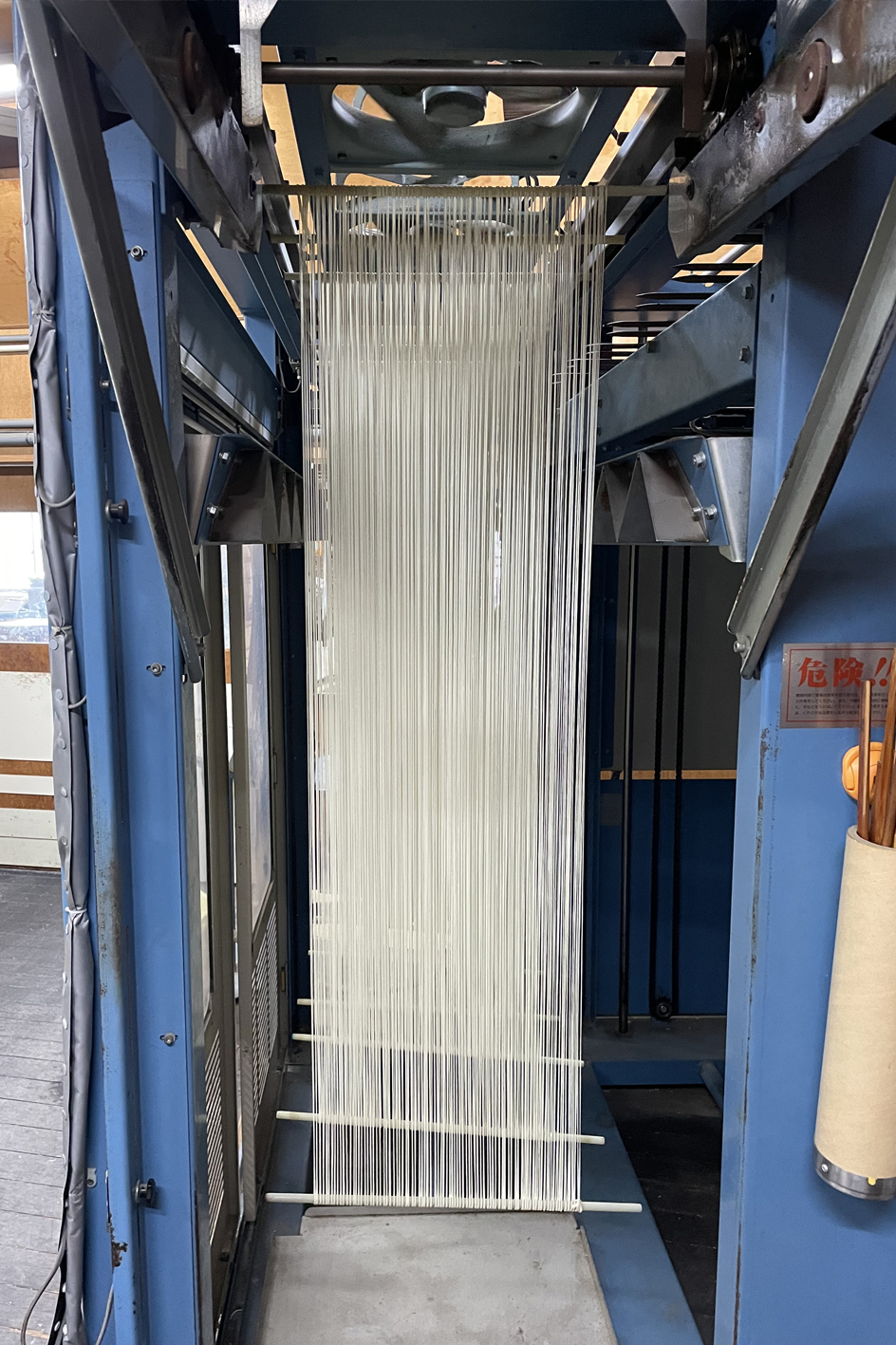 さらに麺を細め、ヨリを掛けながら、「掛け機」の2本1組の管(くだ)に8の字に掛けていきます。