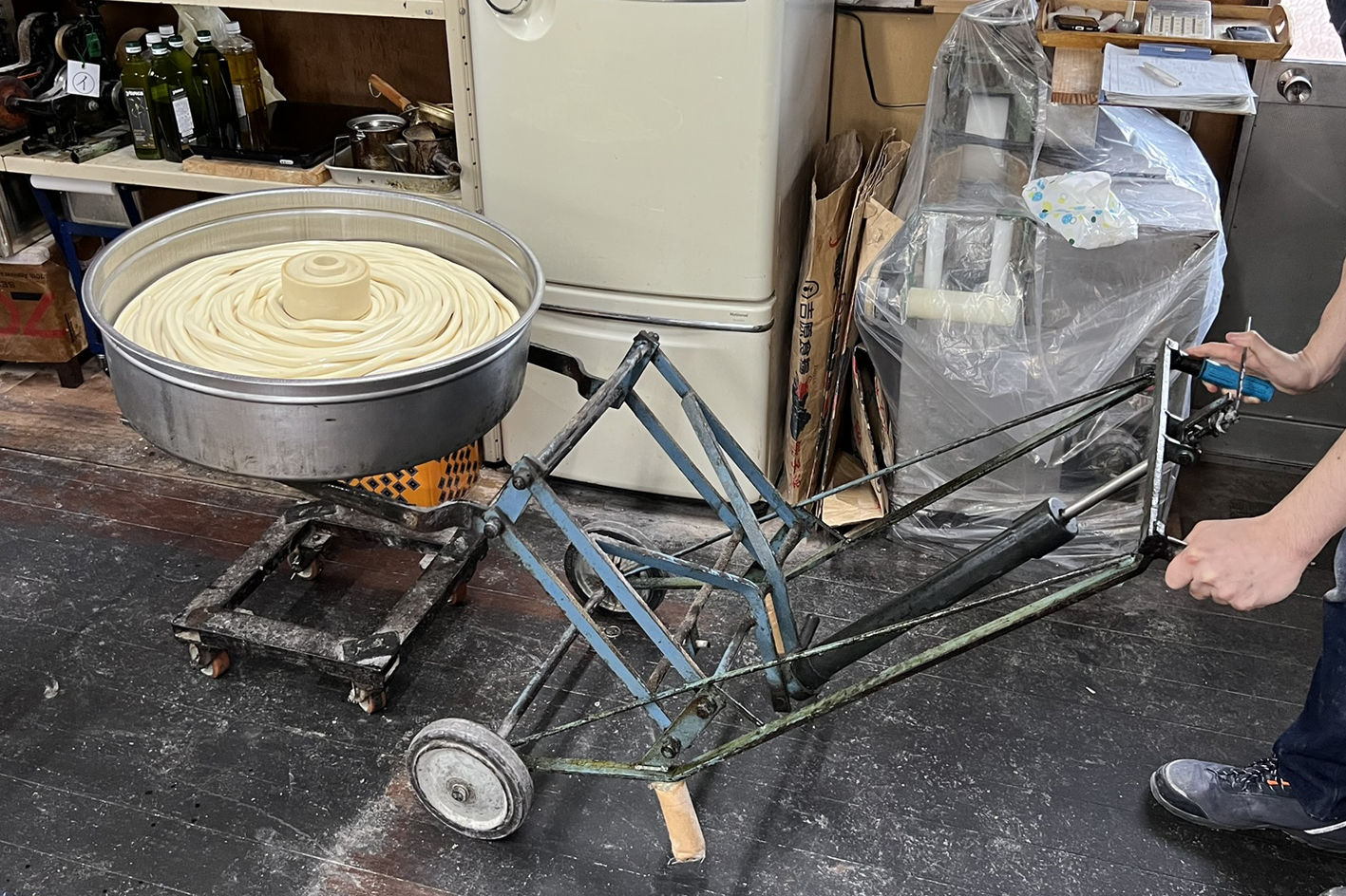 昔は足踏みで行っていた、生地をまとめて整える「麺圧」の工程で使用します。